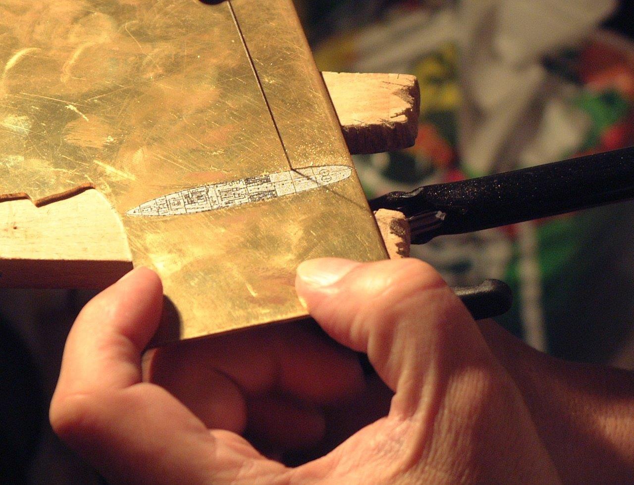 Hier entsteht gerade das MS SCHWABEN. Die Schiffsschale aus Messing säge ich mit der Laubesäge aus.