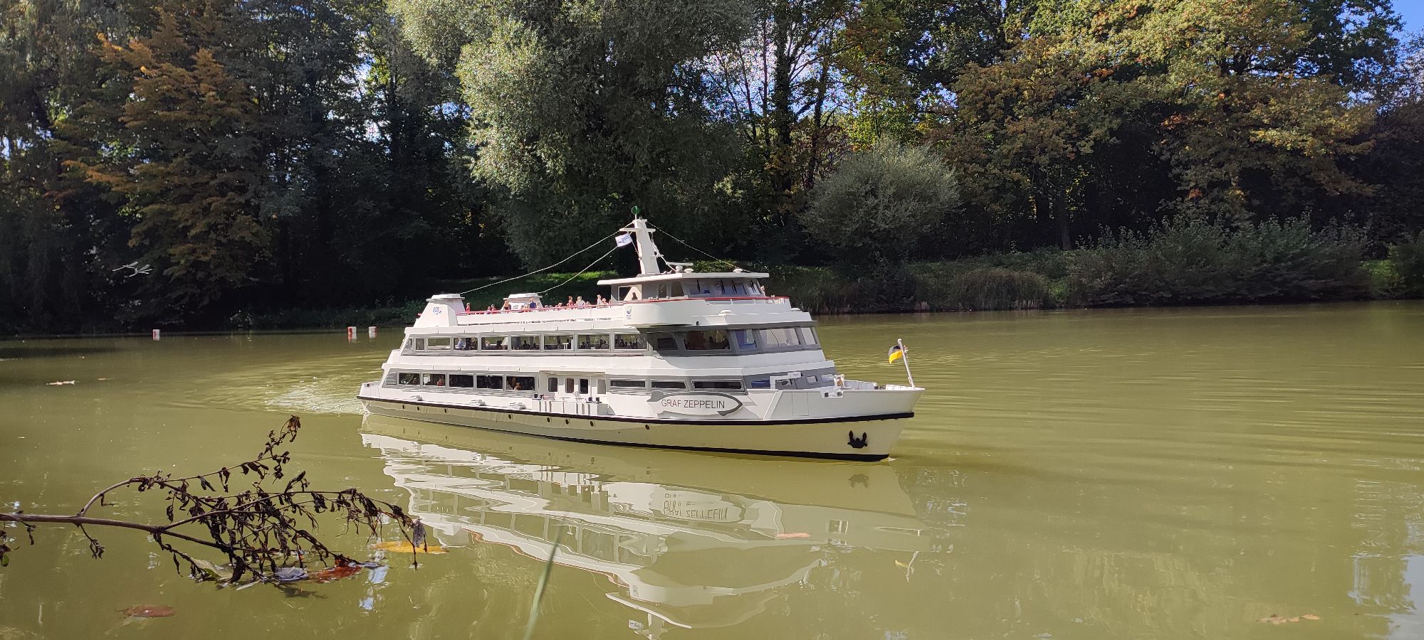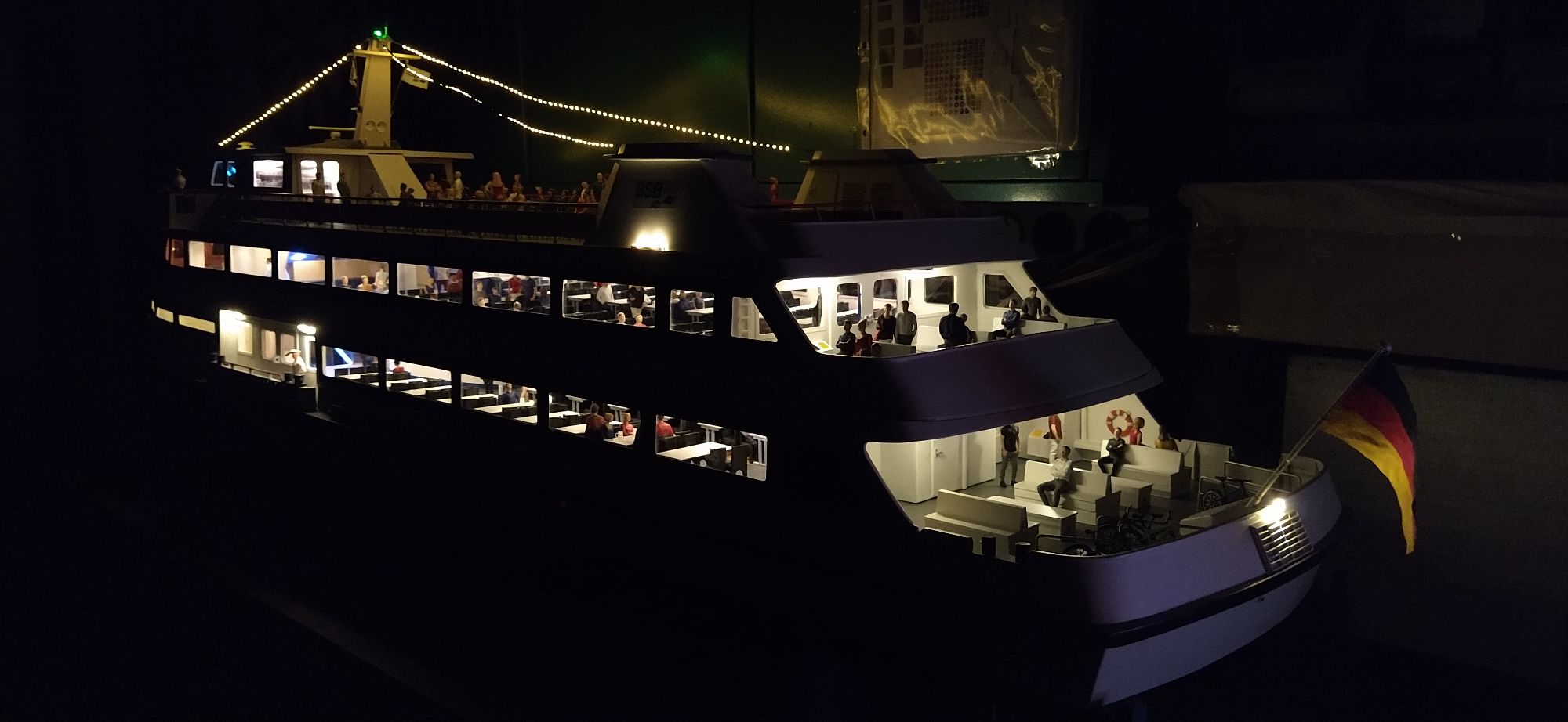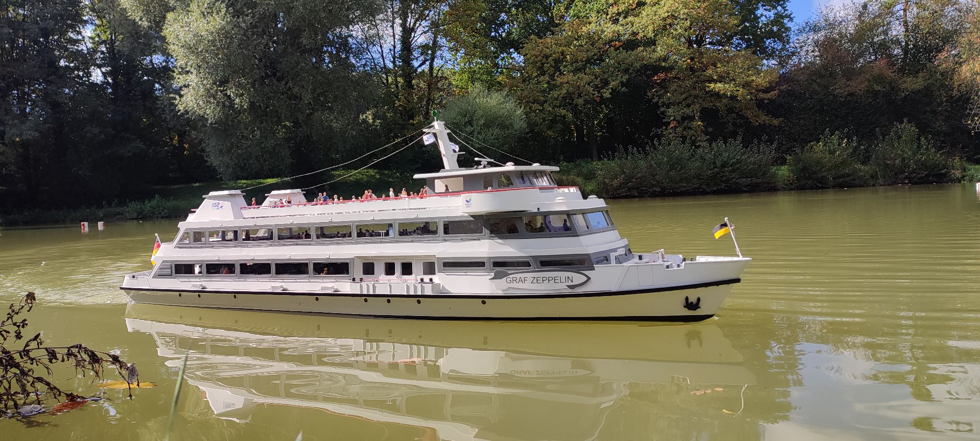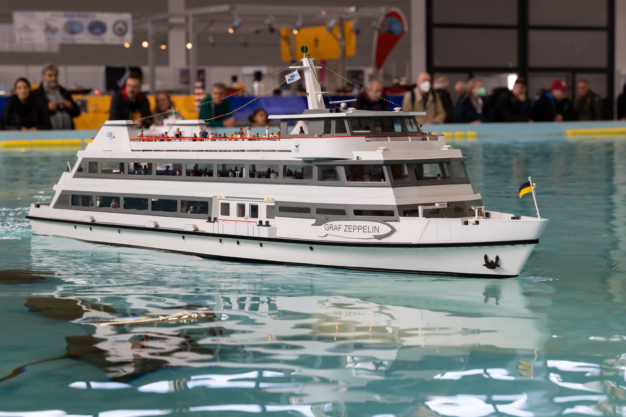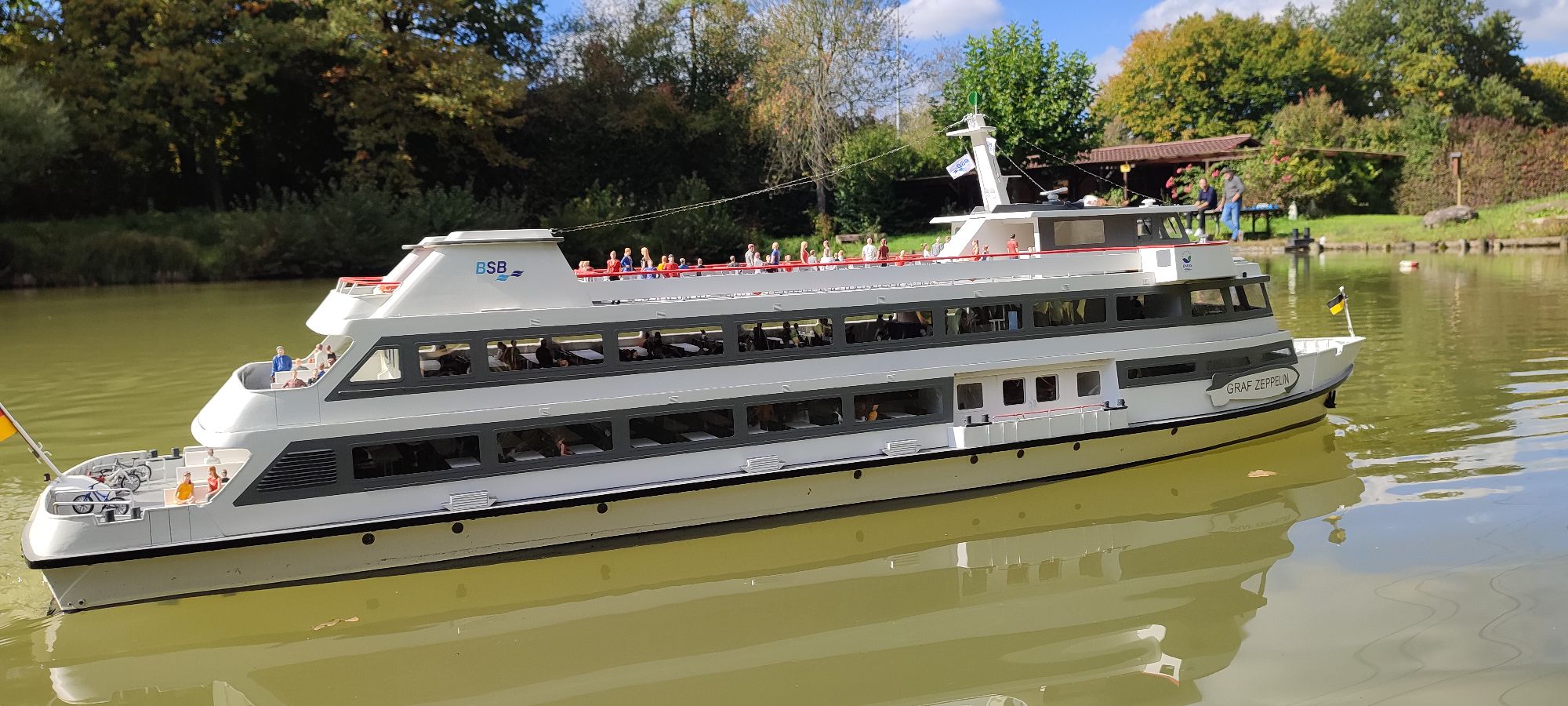 Das Fahrgastschiff “ Zeppelin” wurde anhand von Generalplänen im Maßstab 1:35 erbaut. Die Schale selbst wurde aus GFK erbaut. Die kompletten Aufbauten wurden aus Flugzeugsperrholz gefertigt. Die komplette Inneneinrichtung wurde mittels tausenden von gemachten Fotos nachempfunden. Sämtliche Stühle, Tische oder Details - z.B. auch Feuerlöscher wurden am PC konstruiert und mit zwei 3D-Druckern (FDM und SLA) produziert. Das Modell wird im Zustand aus dem Jahre 2006 dargestellt.